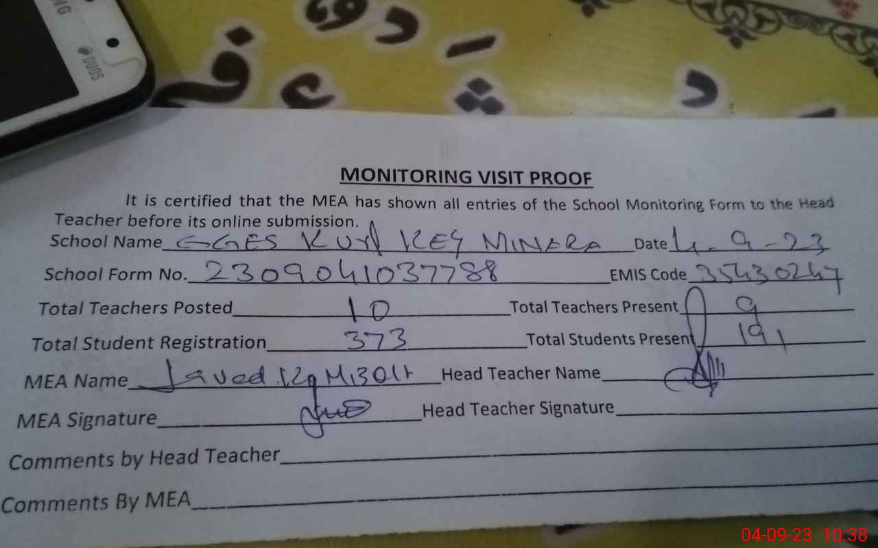 | Attendance Register | Head Teacher | MEA with School | Visit Proof |