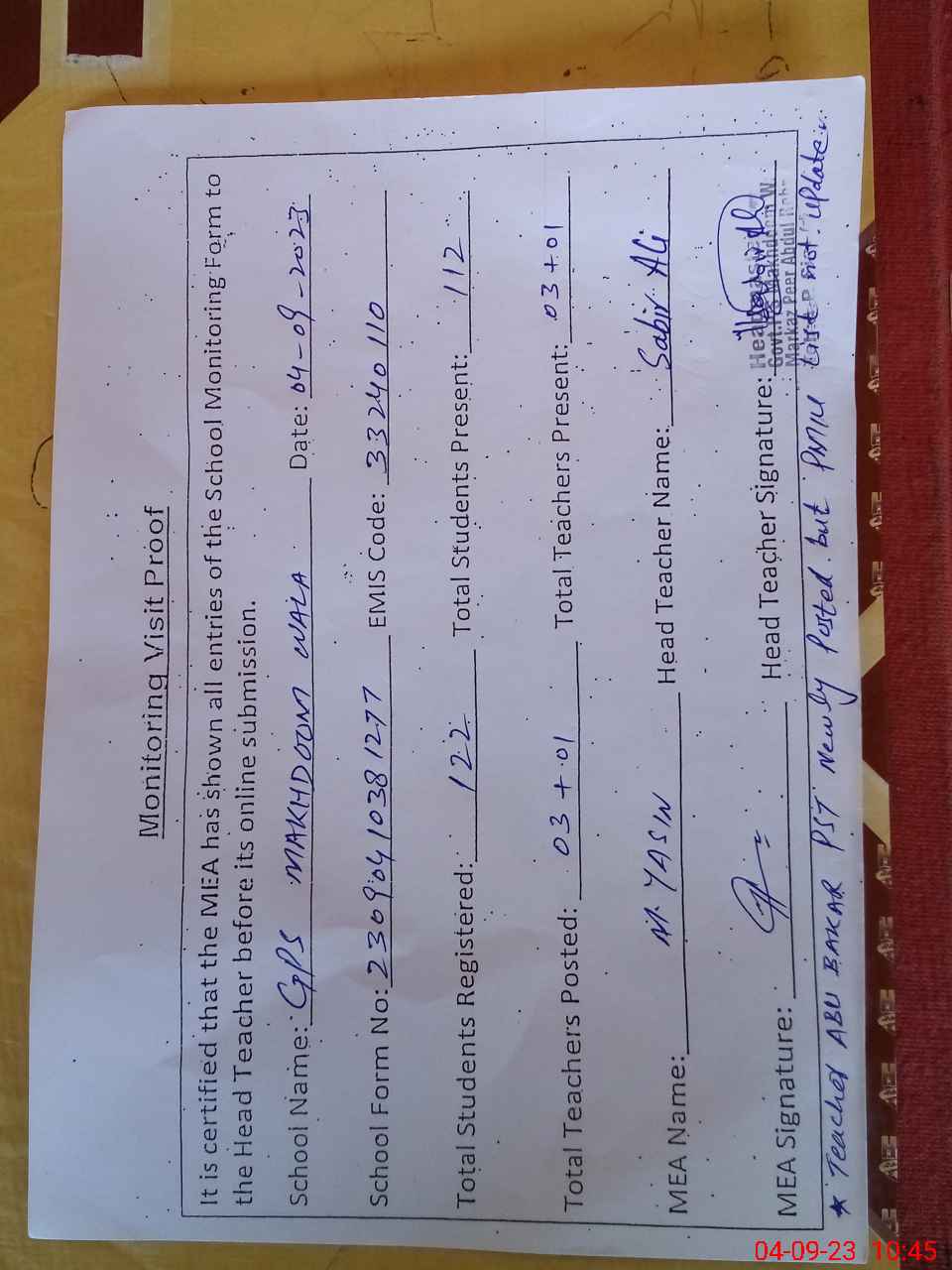 | EMIS Code: 33240110 | Name of School: GPS MAKHDOM WALA | |||