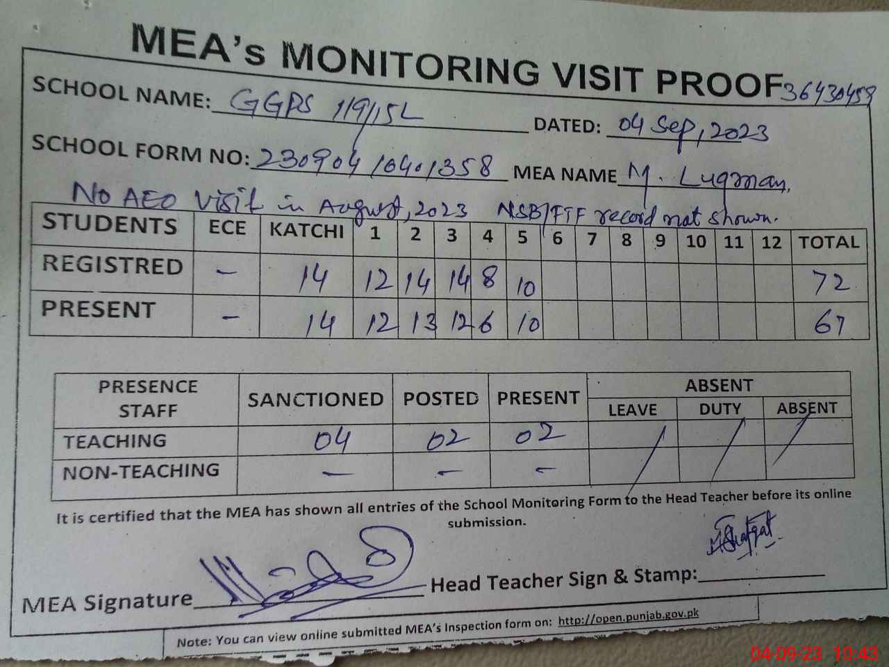 | Attendance Register | Head Teacher | MEA with School | Visit Proof |