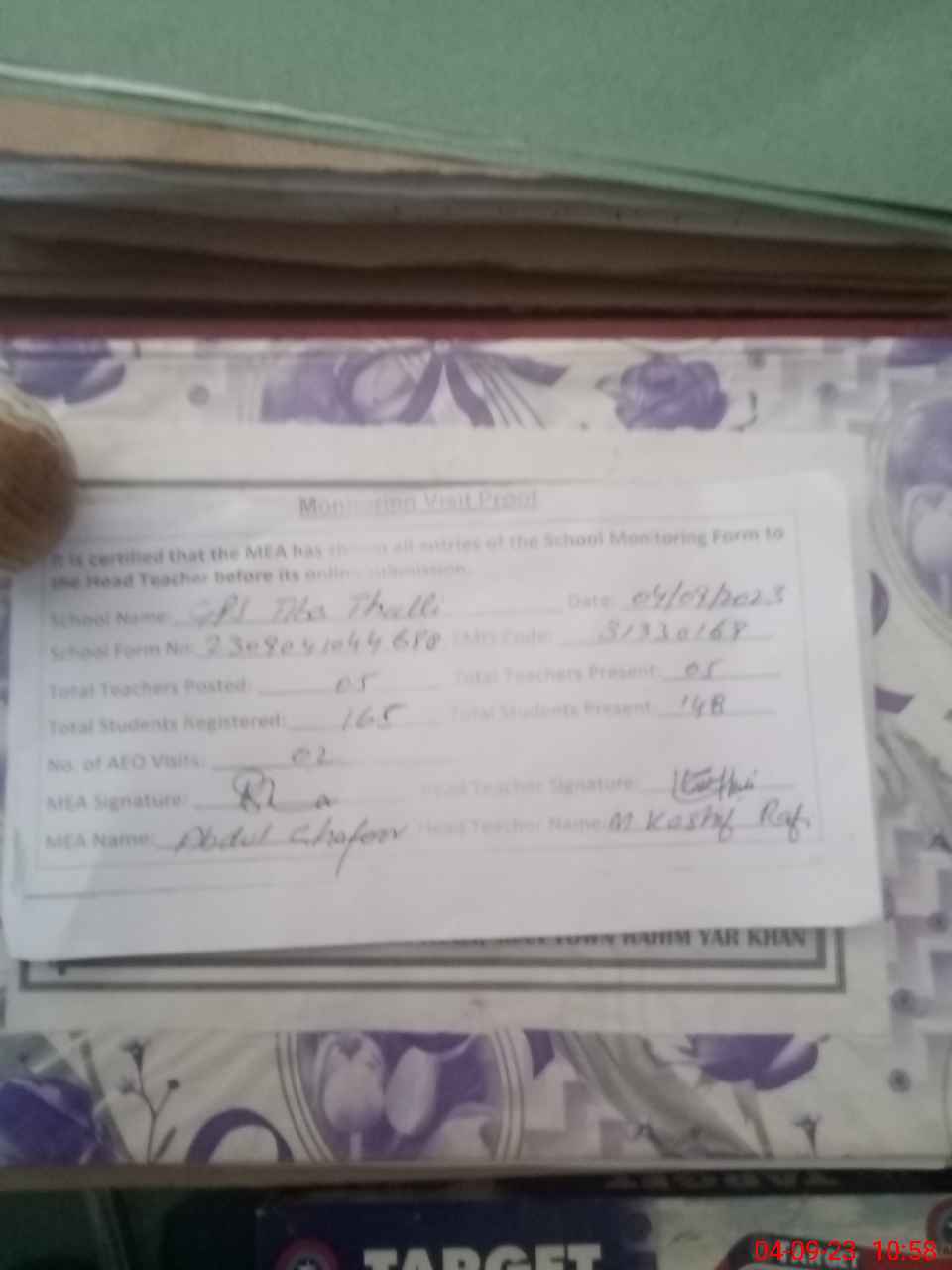 | Attendance Register | Head Teacher | MEA with School | Visit Proof |