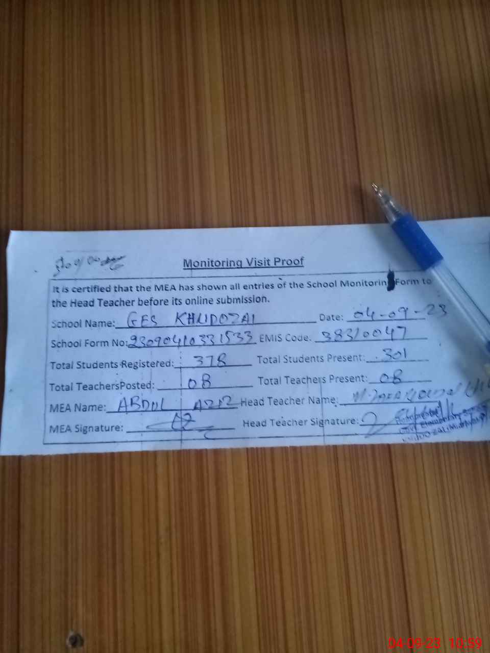 | EMIS Code: 38310047 | Name of School: GES KHUDOZAI | |||