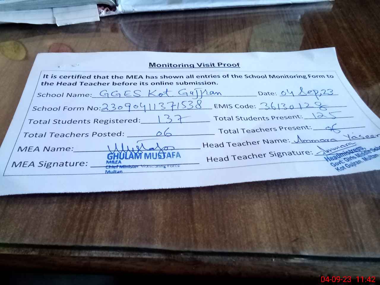 | Attendance Register | Head Teacher | MEA with School | Visit Proof |