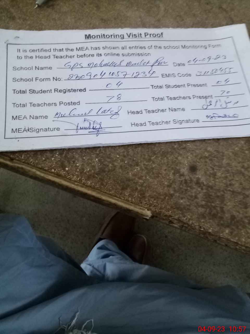 | Attendance Register | Head Teacher | MEA with School | Visit Proof |