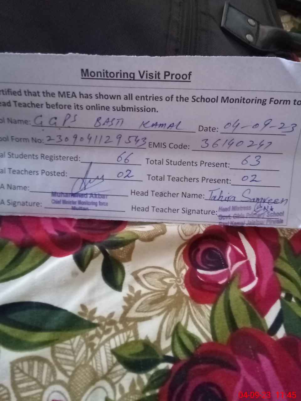 | Attendance Register | Head Teacher | MEA with School | Visit Proof |