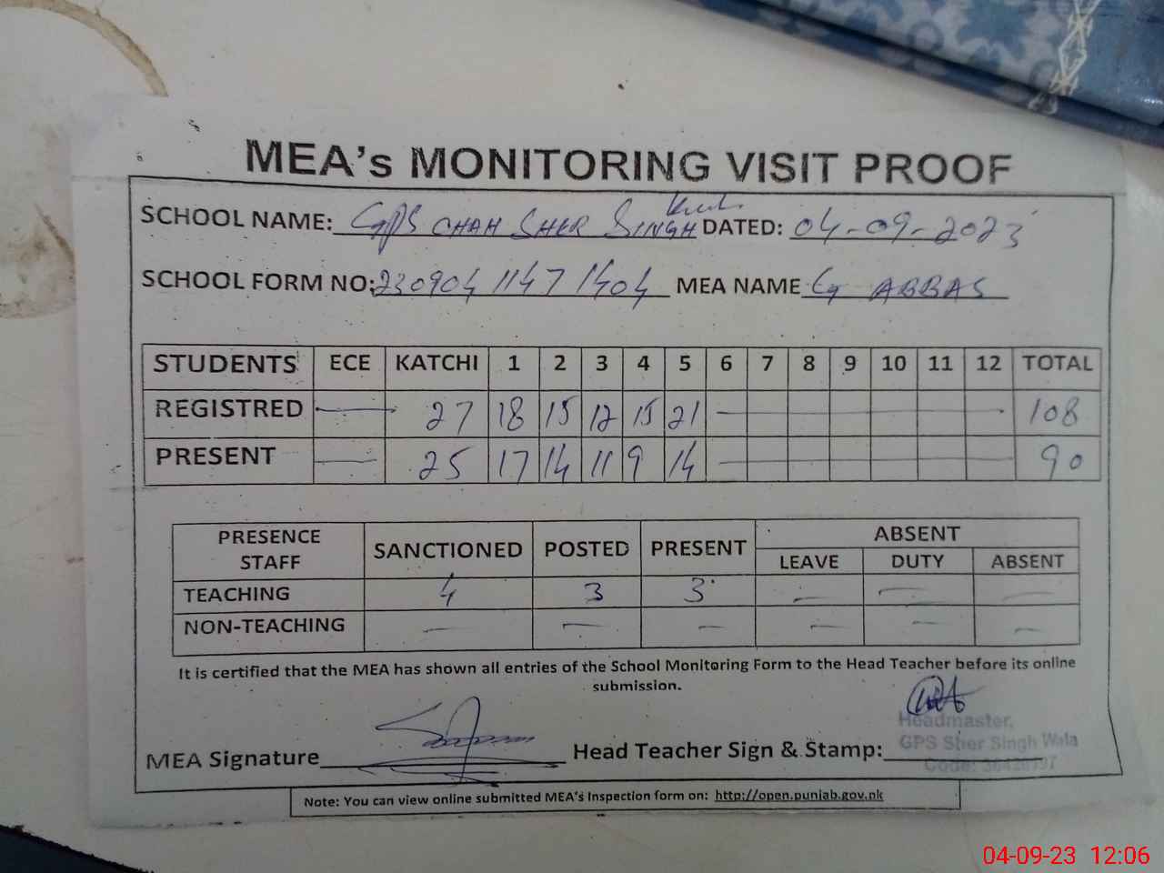 | Attendance Register | Head Teacher | MEA with School | Visit Proof |