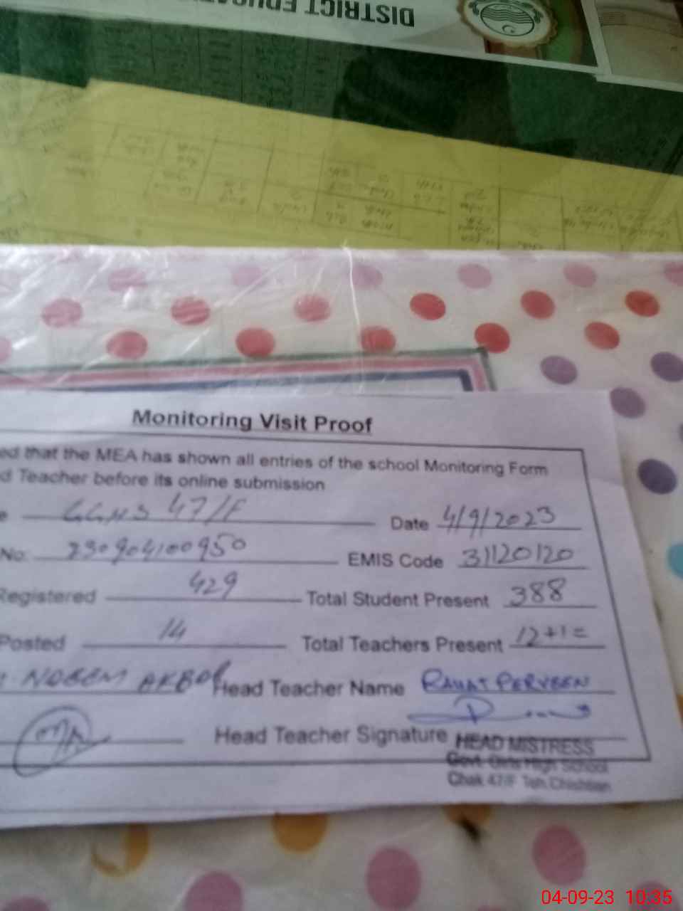 | EMIS Code: 31120120 | Name of School: GGHS CHAK NO. 47/F | |||