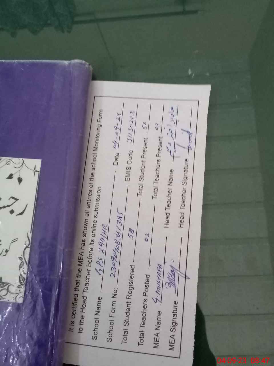 | EMIS Code: 31130223 | Name of School: GPS CHAK NO 294 HR | |||