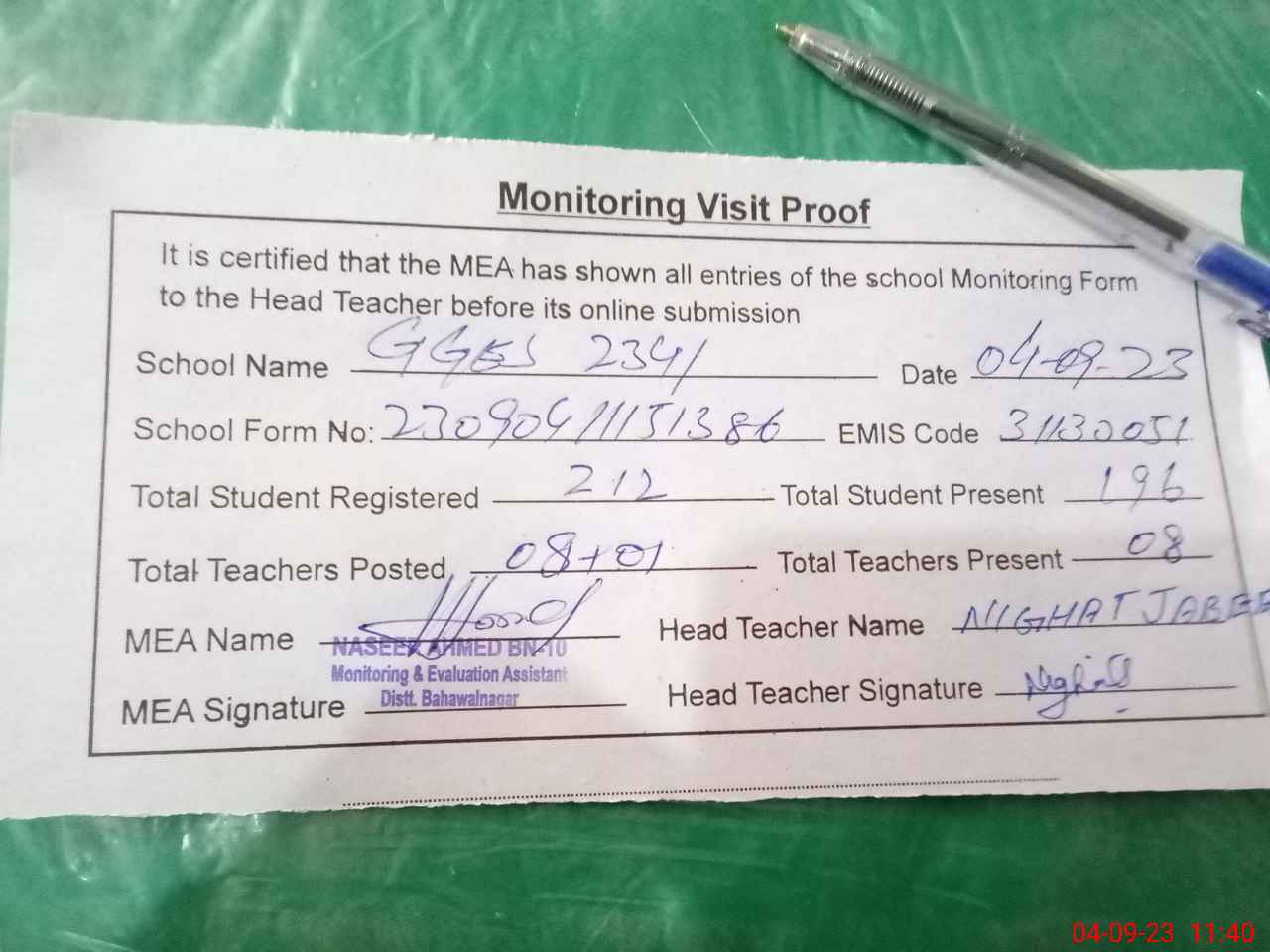| Attendance Register | Head Teacher | MEA with School | Visit Proof |