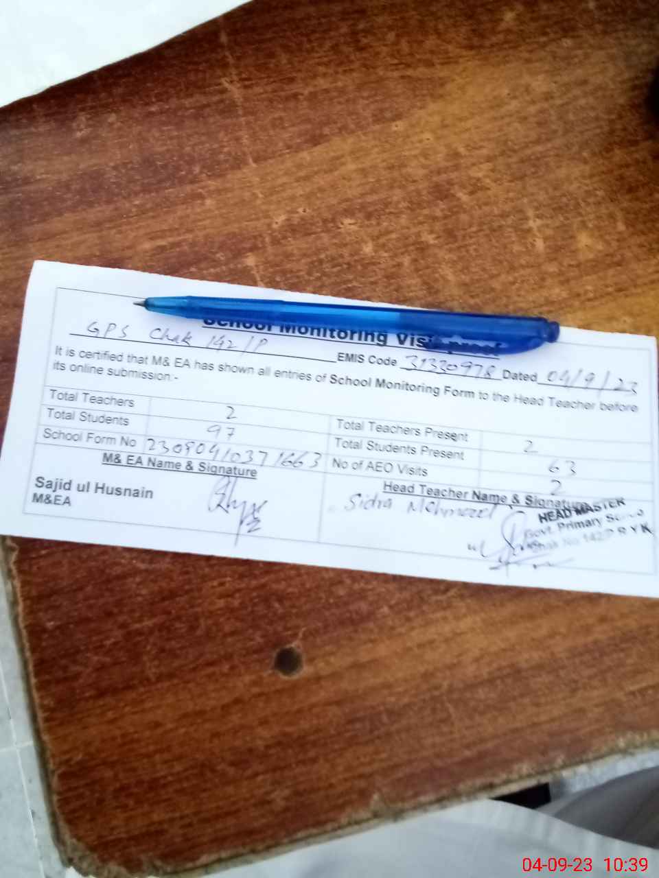 | Attendance Register | Head Teacher | MEA with School | Visit Proof |