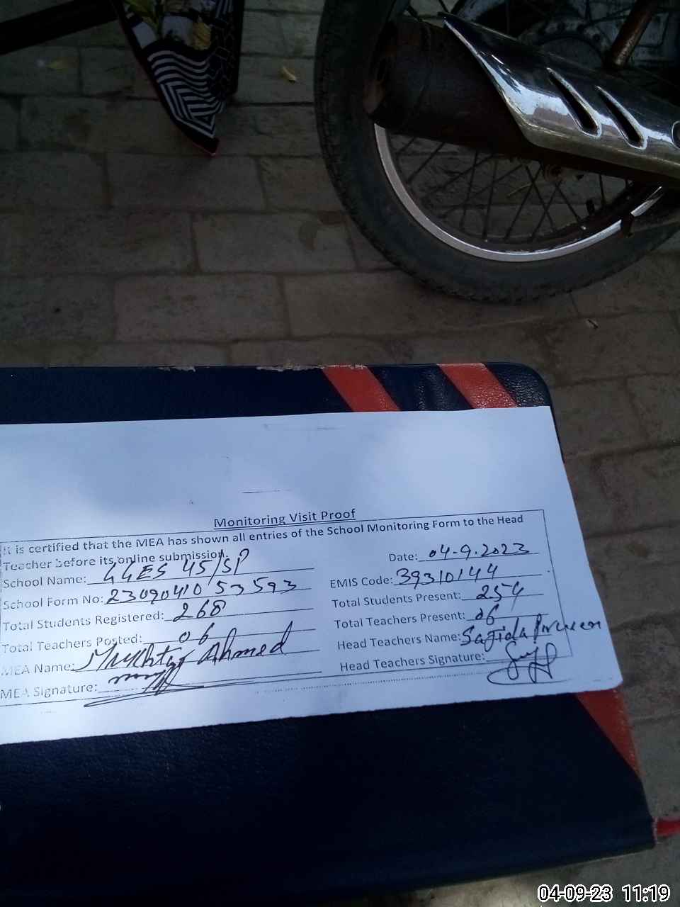 | Attendance Register | Head Teacher | MEA with School | Visit Proof |