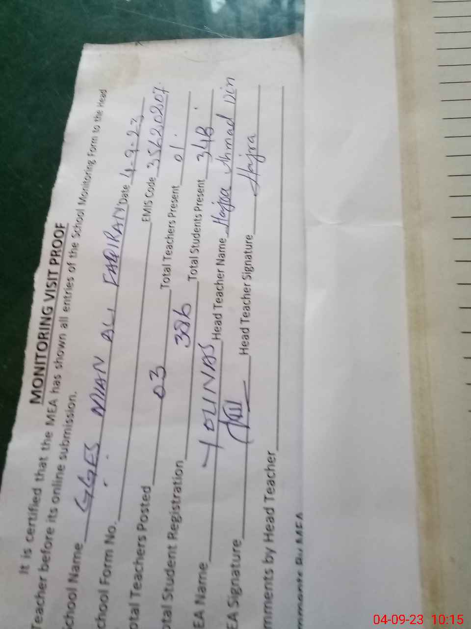 | Attendance Register | Head Teacher | MEA with School | Visit Proof |