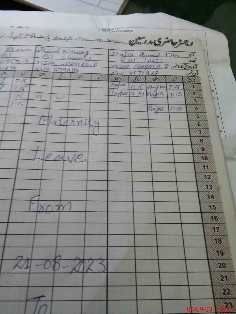 | 35**** | Is**** Na**** | ESE | Contract | 0 | 0 | 0 | 0 | 0 | 0 | 0 | 0 | 0 | Maternity |