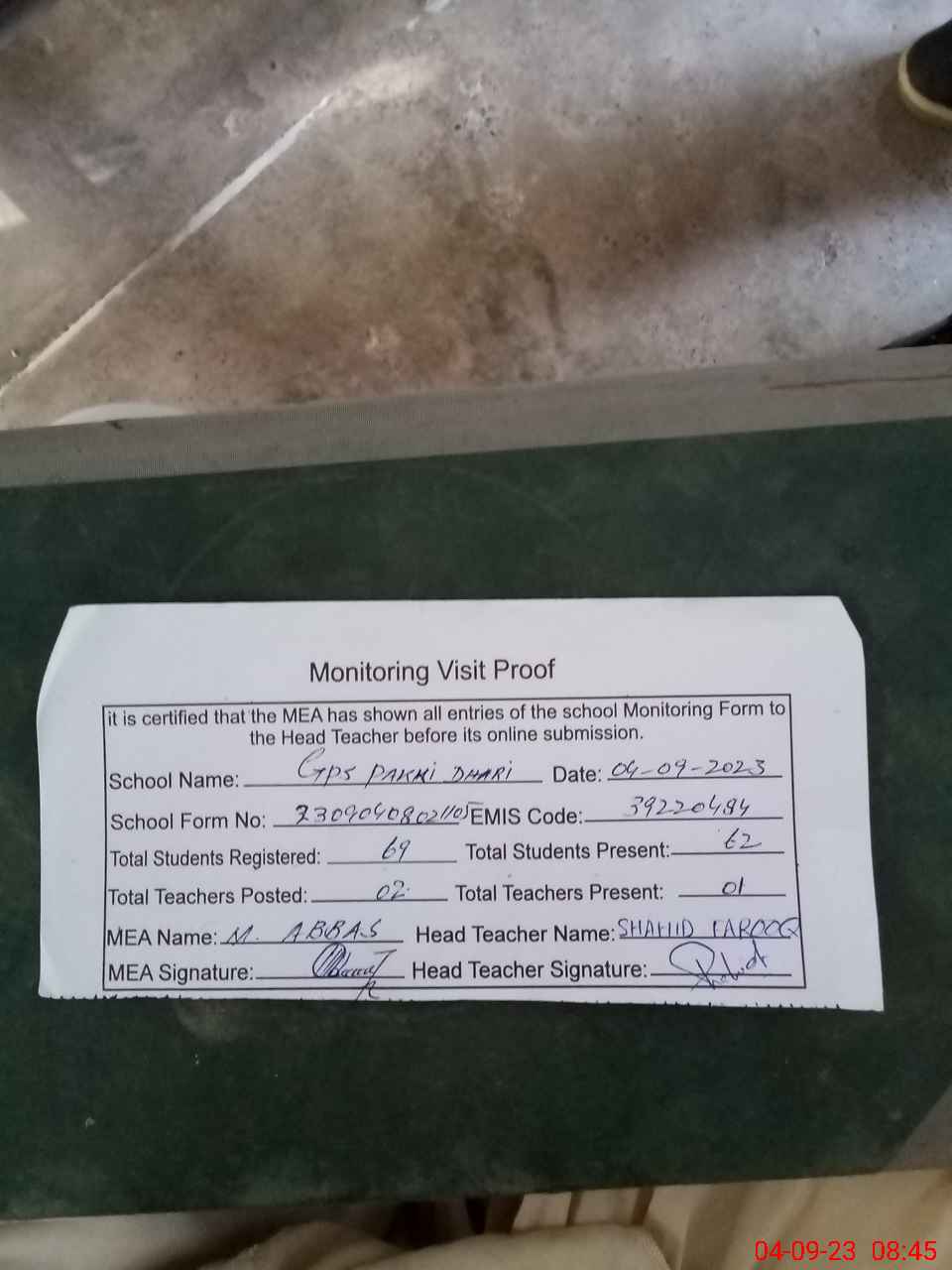 | Attendance Register | Head Teacher | MEA with School | Visit Proof |