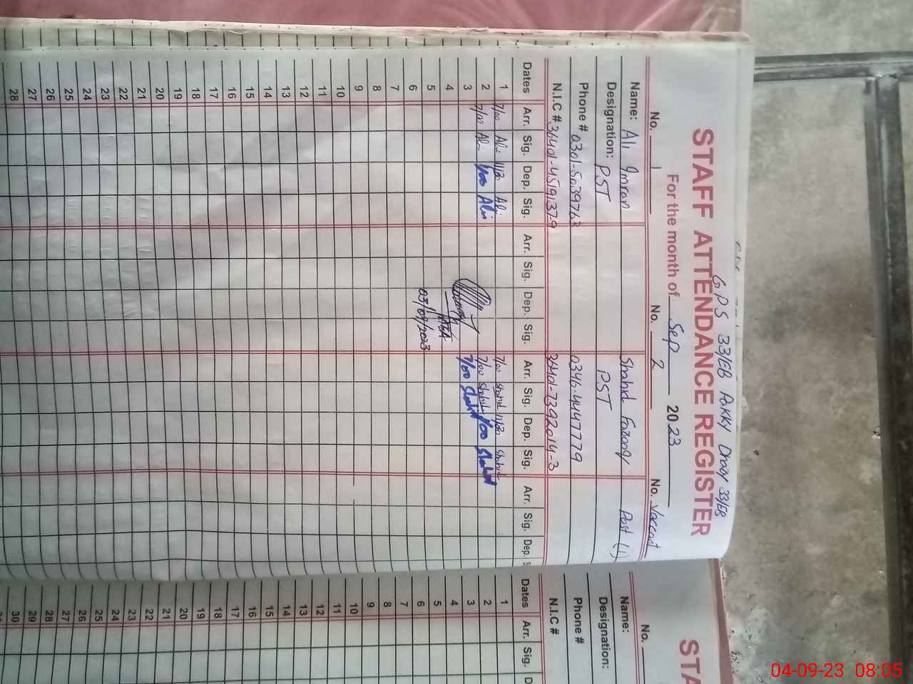 | Name: AL**** IM**** Designation: (School Headmaster's/Headmistress's) PST Phone/Cell Number: 03**** |