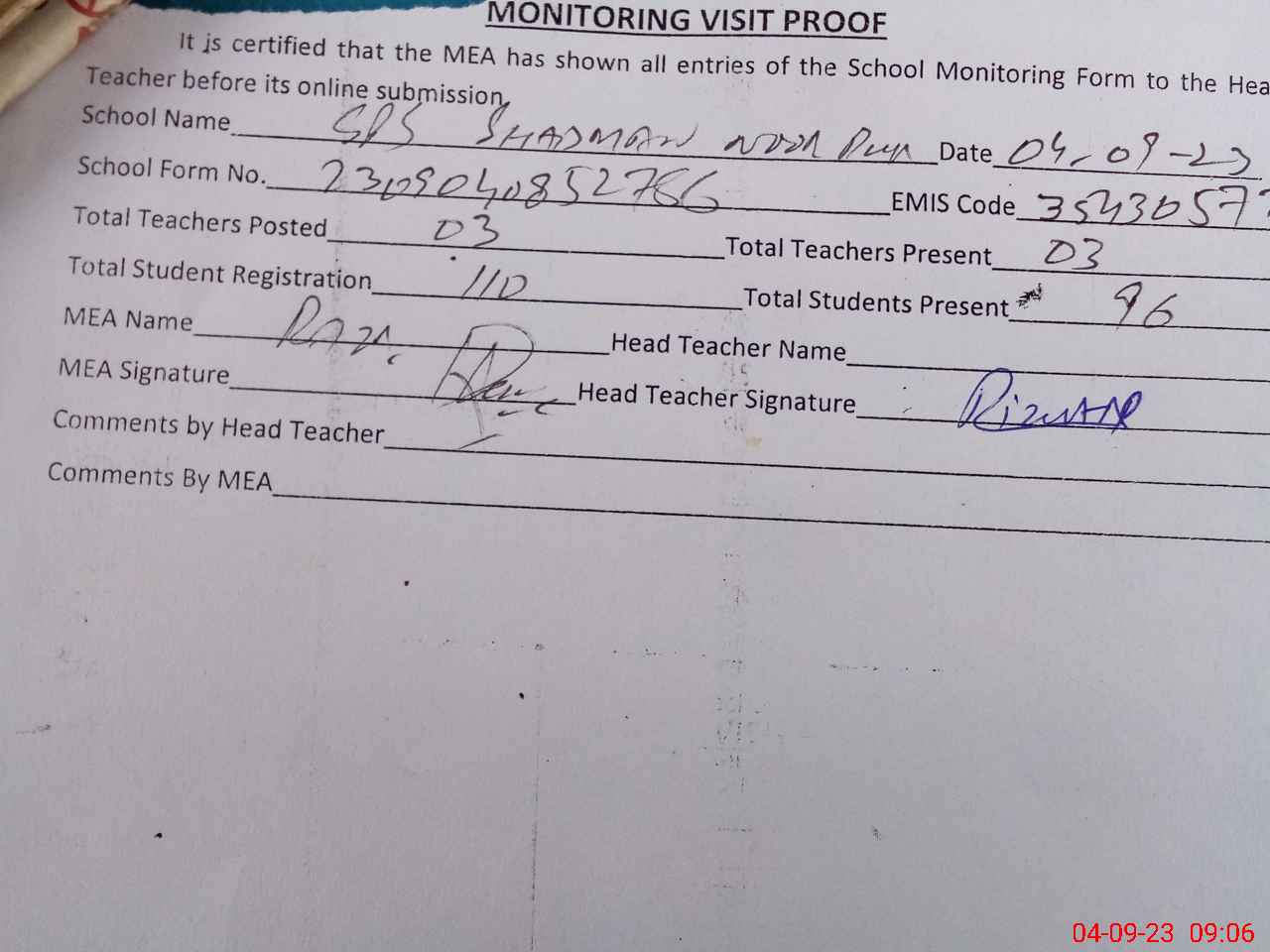 | Attendance Register | Head Teacher | MEA with School | Visit Proof |