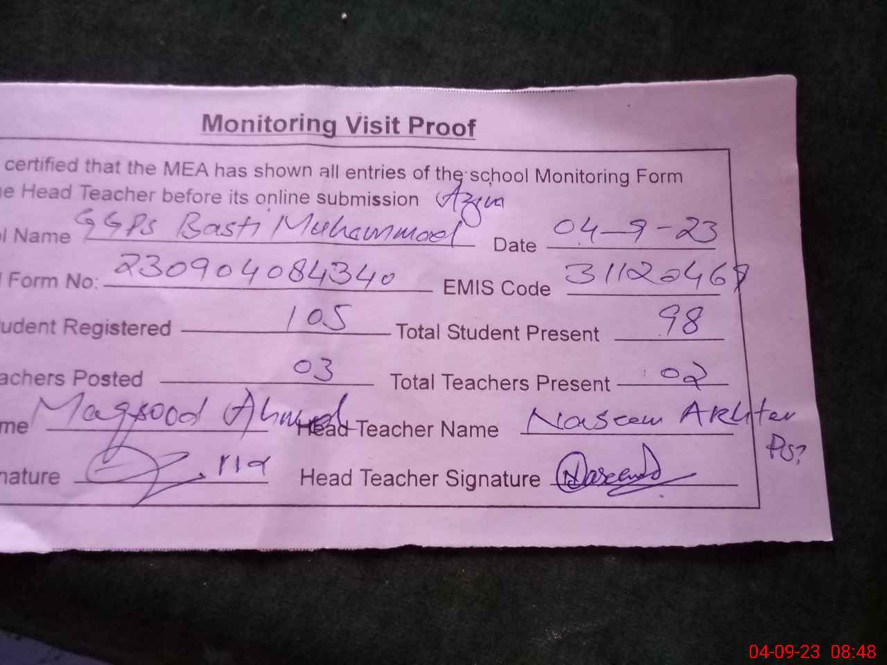 | Attendance Register | Head Teacher | MEA with School | Visit Proof |