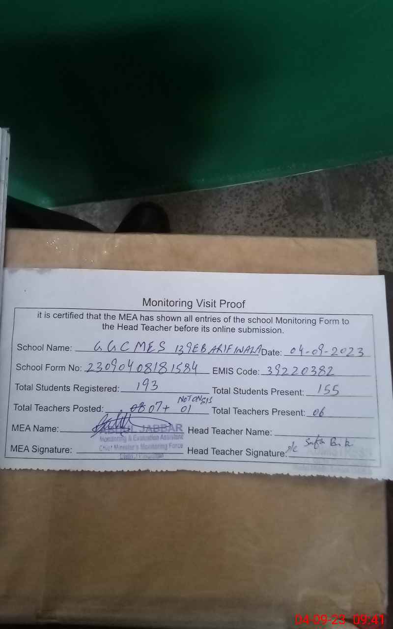 | EMIS Code: 39220382 | Name of School: GGCMES 139 EB ARIFWALA | |||