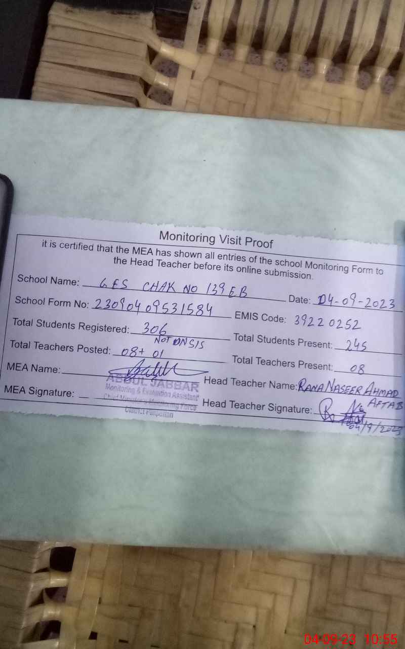 | EMIS Code: 39220252 | Name of School: GES CHAK NO 139 EB | |||