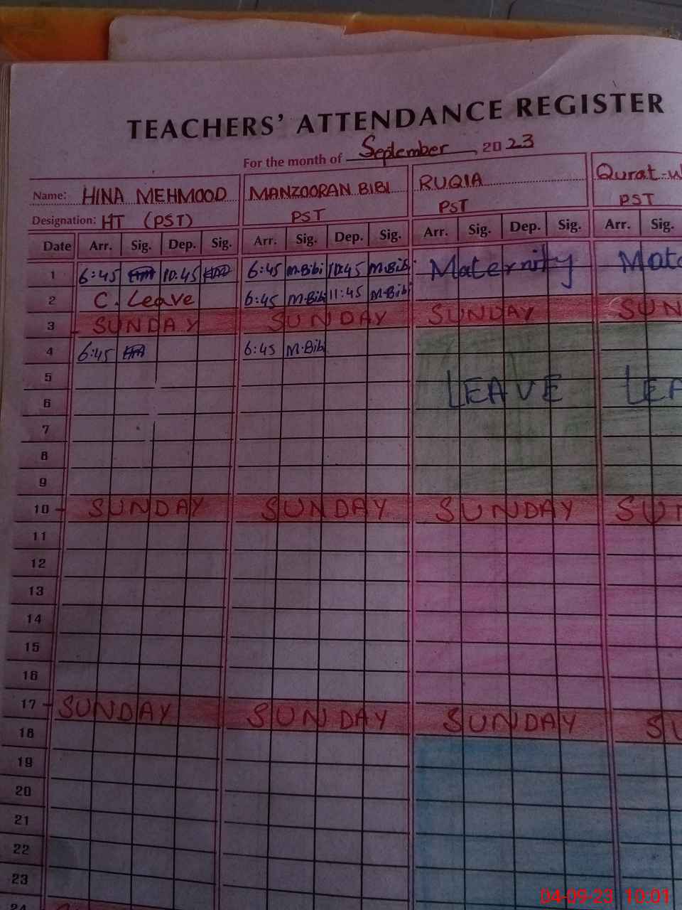 | 33**** | Qu**** UlAi**** Al**** | PST | Regular | 0 | 0 | 0 | 0 | 0 | 0 | 0 | 0 | 0 | Absent (Un-Authorized) |