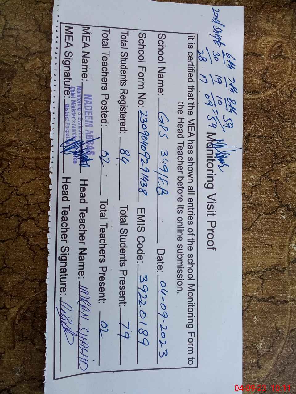 | EMIS Code: 39220189 | Name of School: GPS 349 EB | |||