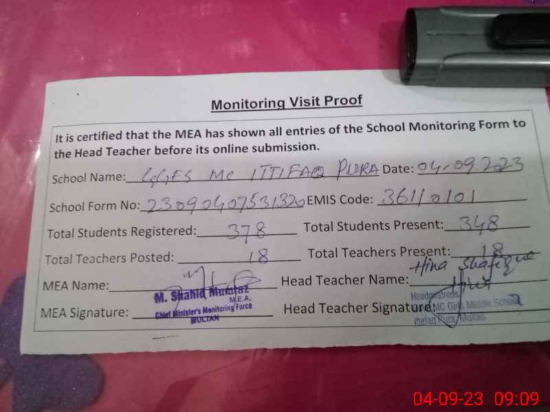 | EMIS Code: 36110101 | Name of School: GGES MC ITTEFAQ PURA MULTAN | |||