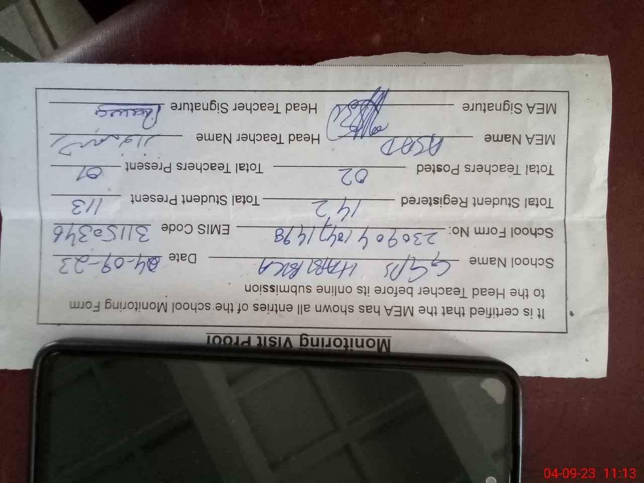 | Attendance Register | Head Teacher | MEA with School | Visit Proof |