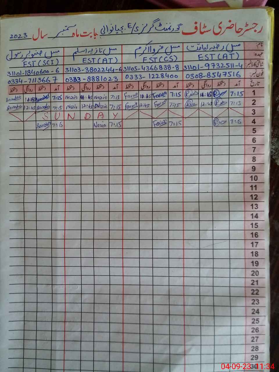| Remarks (Use Separate Page if Required): Mrs Aysha Siddiqa CNIC 3110577691008 PST is on temporary duty to GGPS people kalsana since 2019 School is desprately need of teacher as there are only 5 teachers are posted in this school The only available PST teacher Ms Aysha is temporary attached since last 5 years There are no written orders for her temporary duty are present in the school As the school is affected by flood water the electricity is not available in the school | |||||