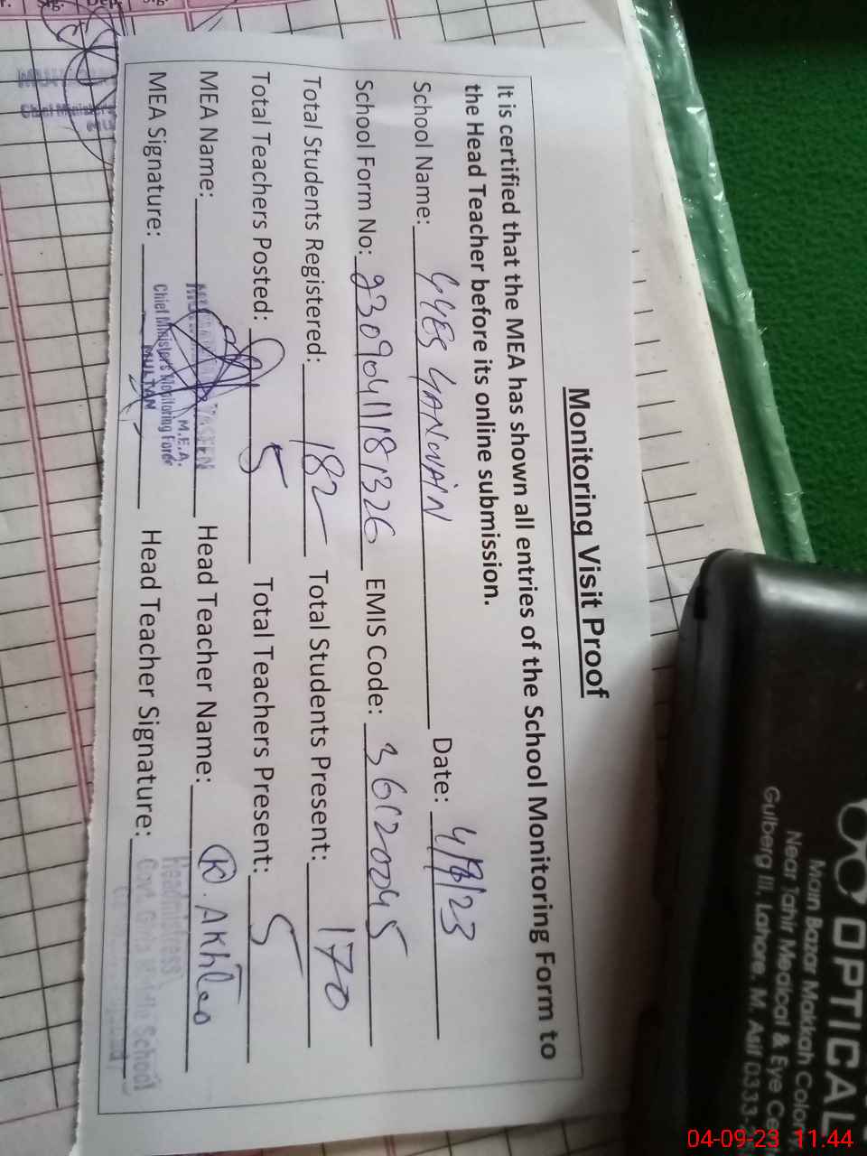 | Attendance Register | Head Teacher | MEA with School | Visit Proof |