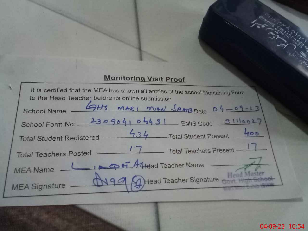 | Attendance Register | Head Teacher | MEA with School | Visit Proof |