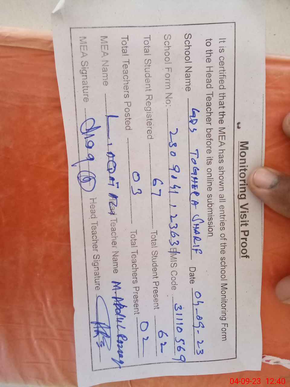 | Attendance Register | Head Teacher | MEA with School | Visit Proof |