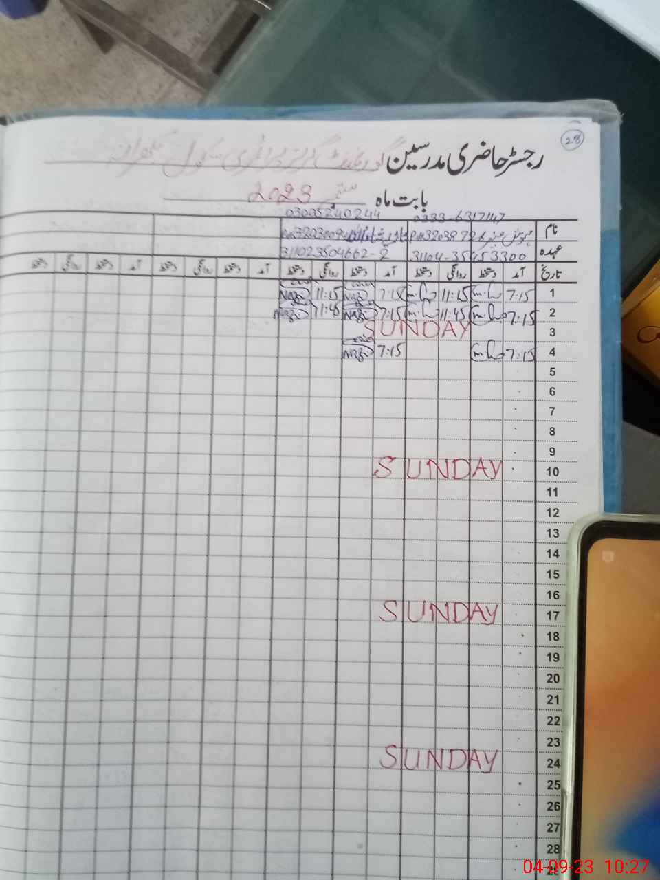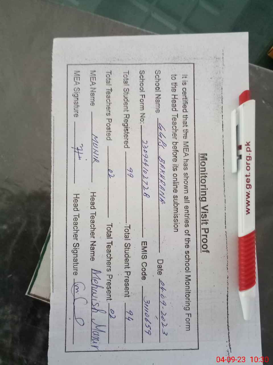| Attendance Register | Head Teacher | MEA with School | Visit Proof |