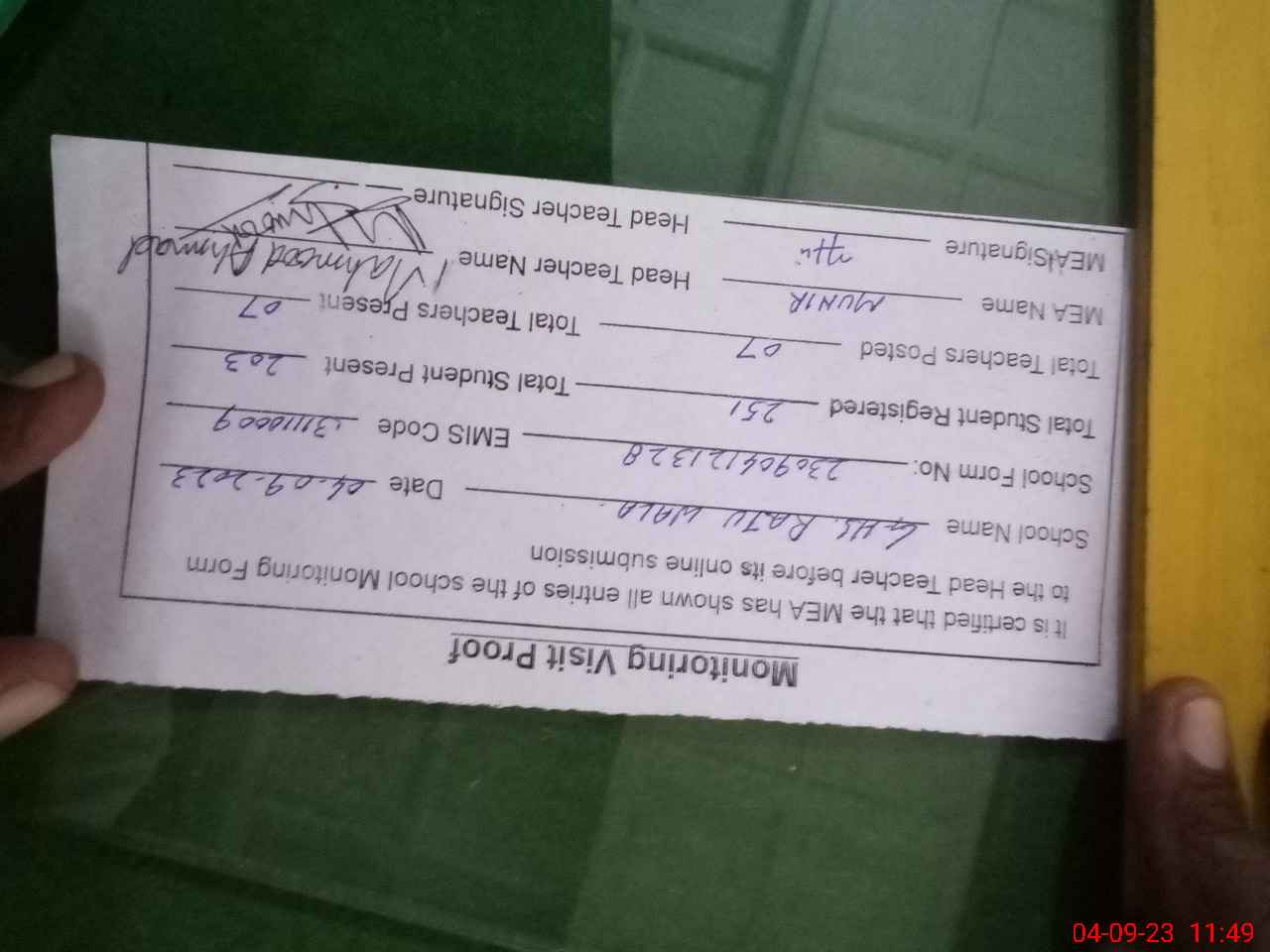 | Attendance Register | Head Teacher | MEA with School | Visit Proof |