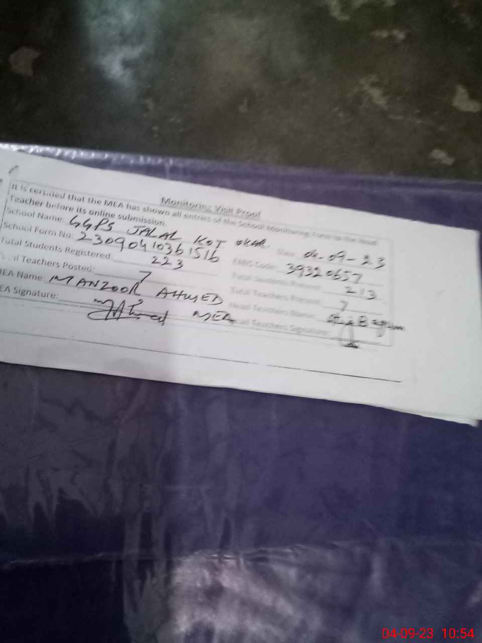 | Attendance Register | Head Teacher | MEA with School | Visit Proof |
