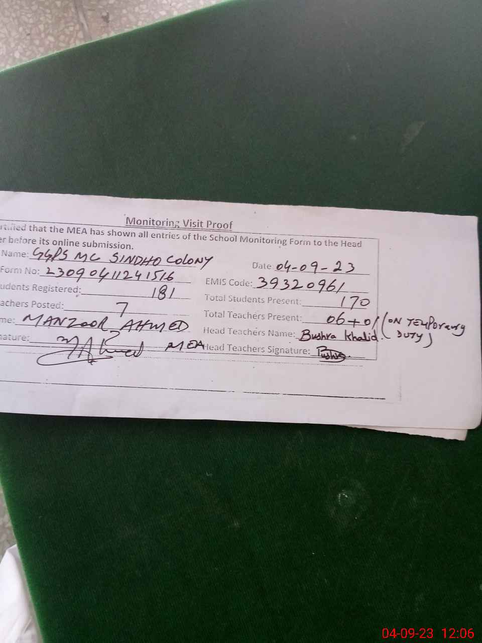 | EMIS Code: 39320961 | Name of School: GGPS MC SINDHO COLONY | |||