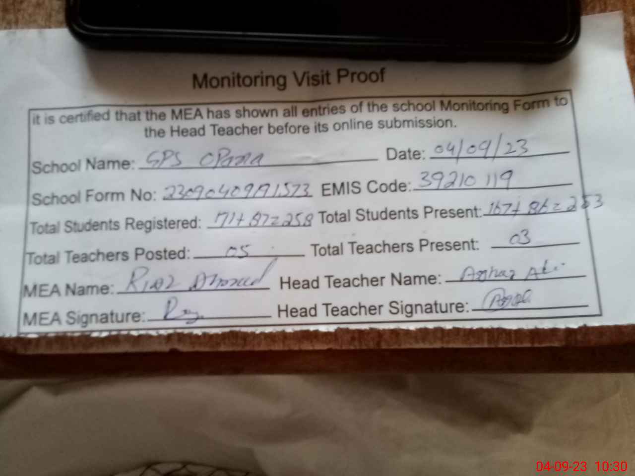 | Attendance Register | Head Teacher | MEA with School | Visit Proof |
