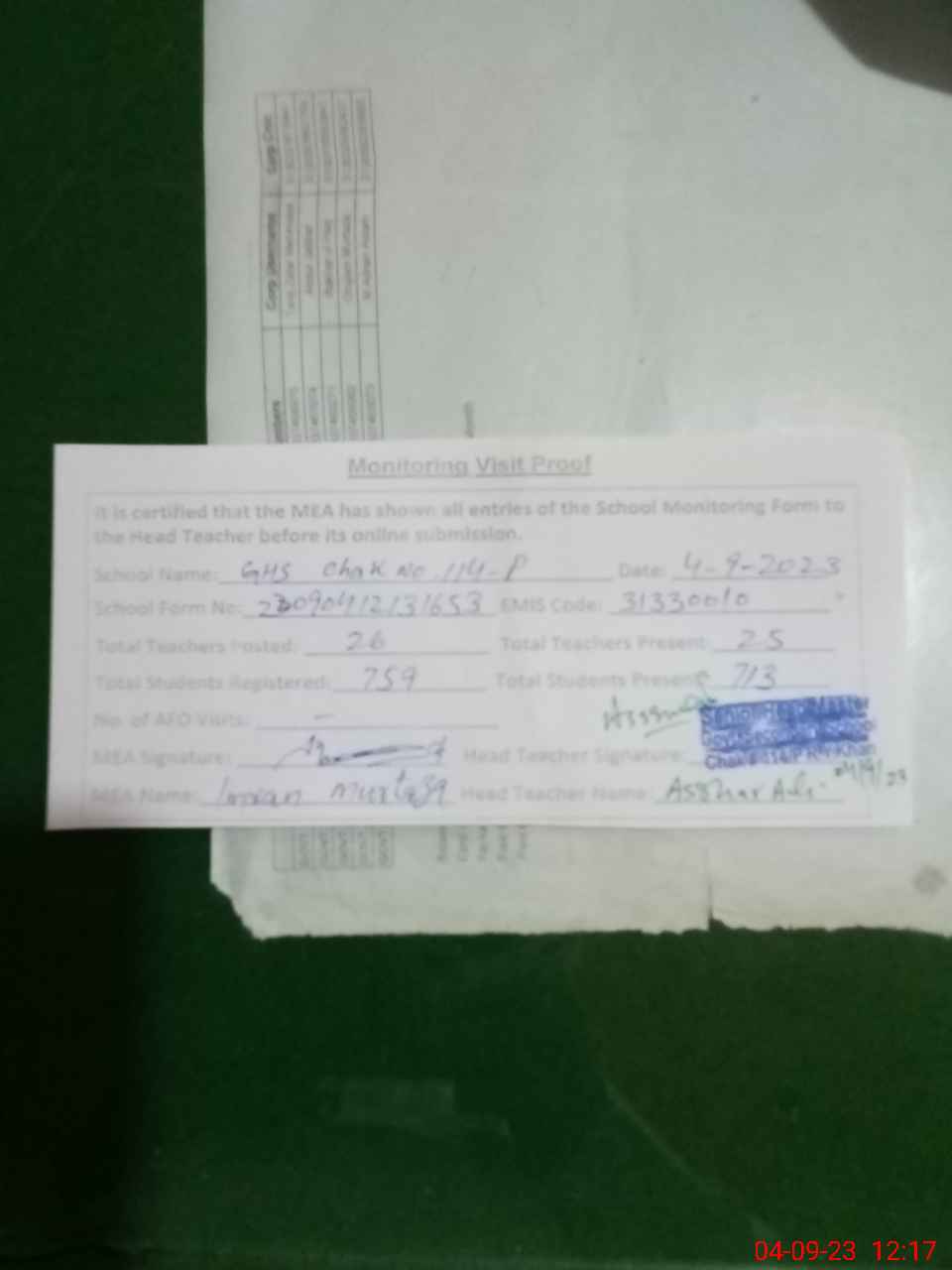 | EMIS Code: 31330010 | Name of School: GHS CHAK 114/P | |||