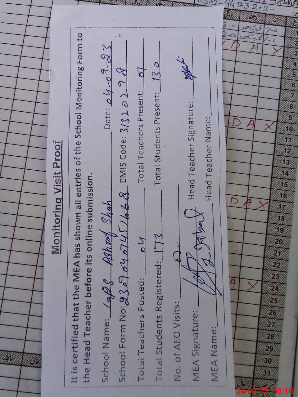 | Attendance Register | Head Teacher | MEA with School | Visit Proof |