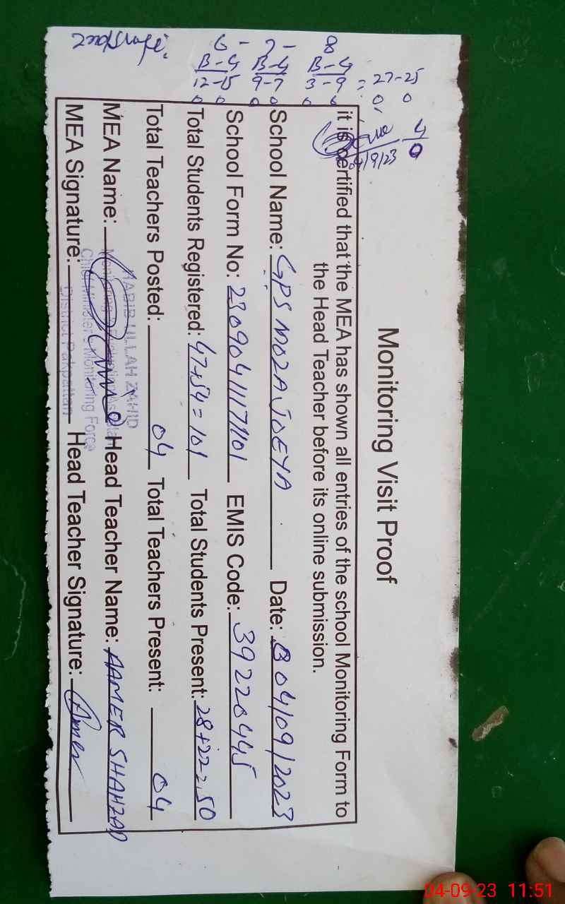 | EMIS Code: 39220445 | Name of School: GPS JOYIA P.O NOORA PATH ARIF WALA | |||