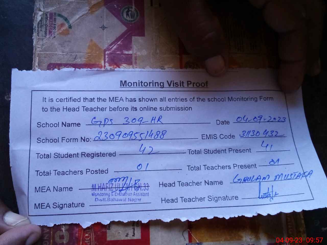 | Attendance Register | Head Teacher | MEA with School | Visit Proof |