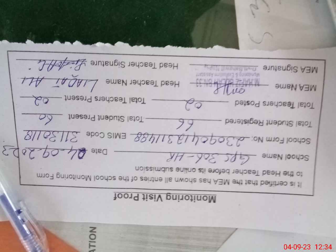 | Attendance Register | Head Teacher | MEA with School | Visit Proof |
