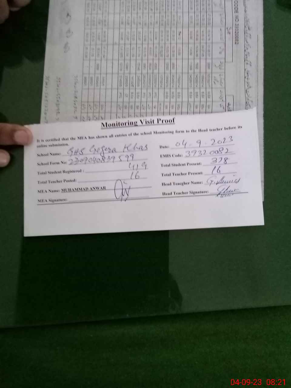 | Attendance Register | Head Teacher | MEA with School | Visit Proof |