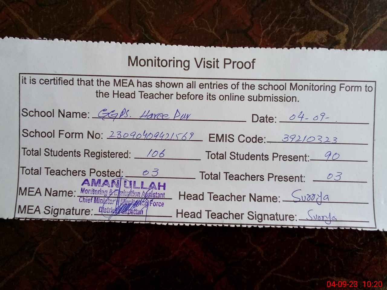 | Attendance Register | Head Teacher | MEA with School | Visit Proof |