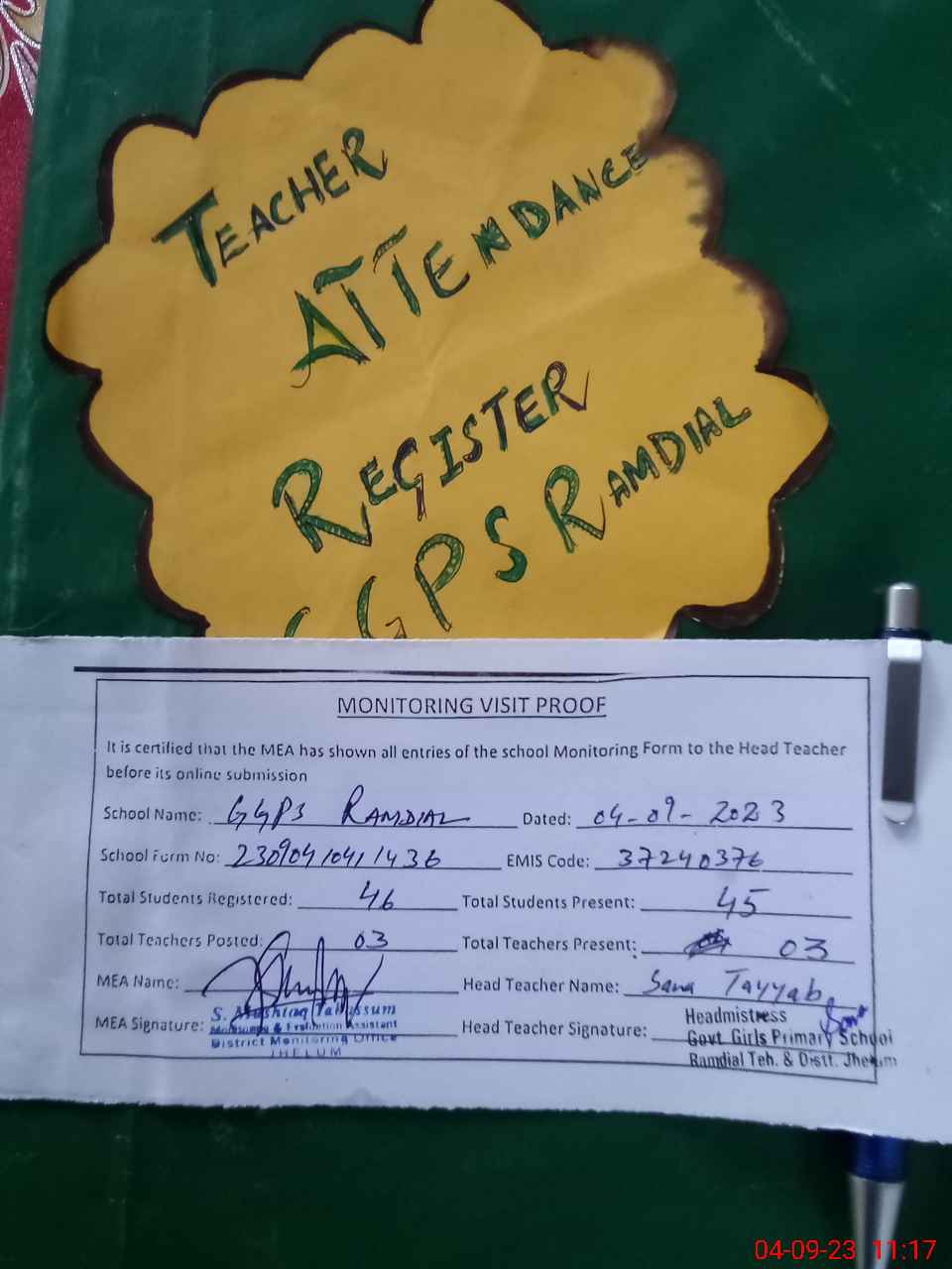 | Attendance Register | Head Teacher | MEA with School | Visit Proof |