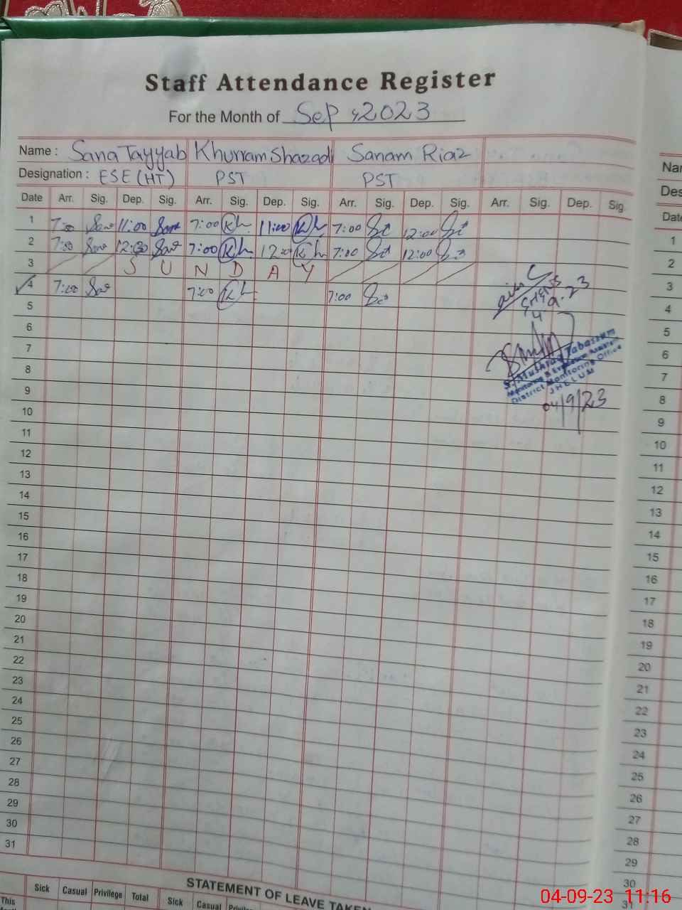 | Monitoring Date: 04-09-2023 | Start Time: 04-09-2023 10:41 AM | End Time: 04-09-2023 11:18 AM | Name of MEA: Sh**** Mu**** Ta**** | |