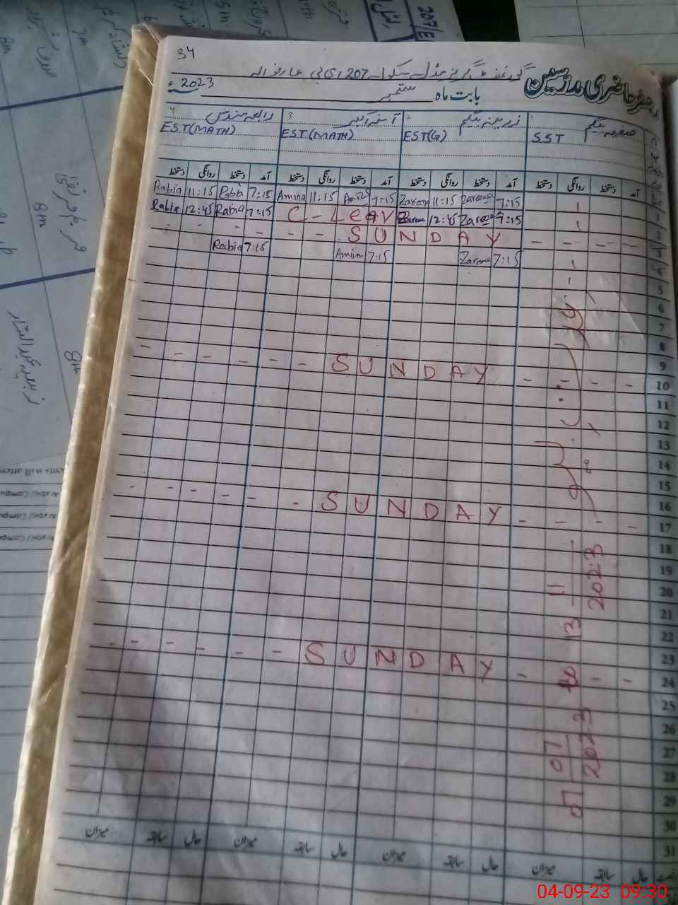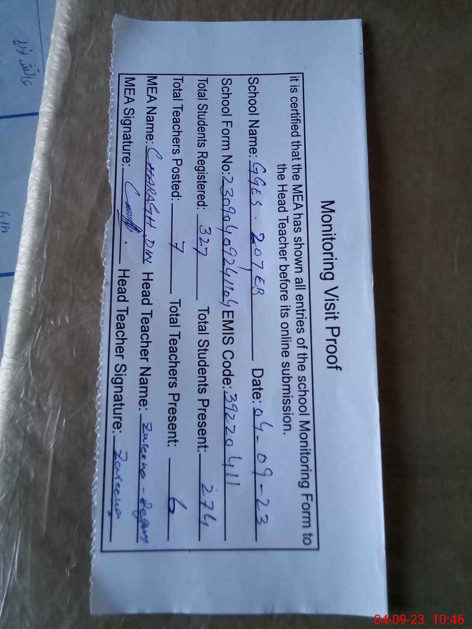 | Attendance Register | Head Teacher | MEA with School | Visit Proof |