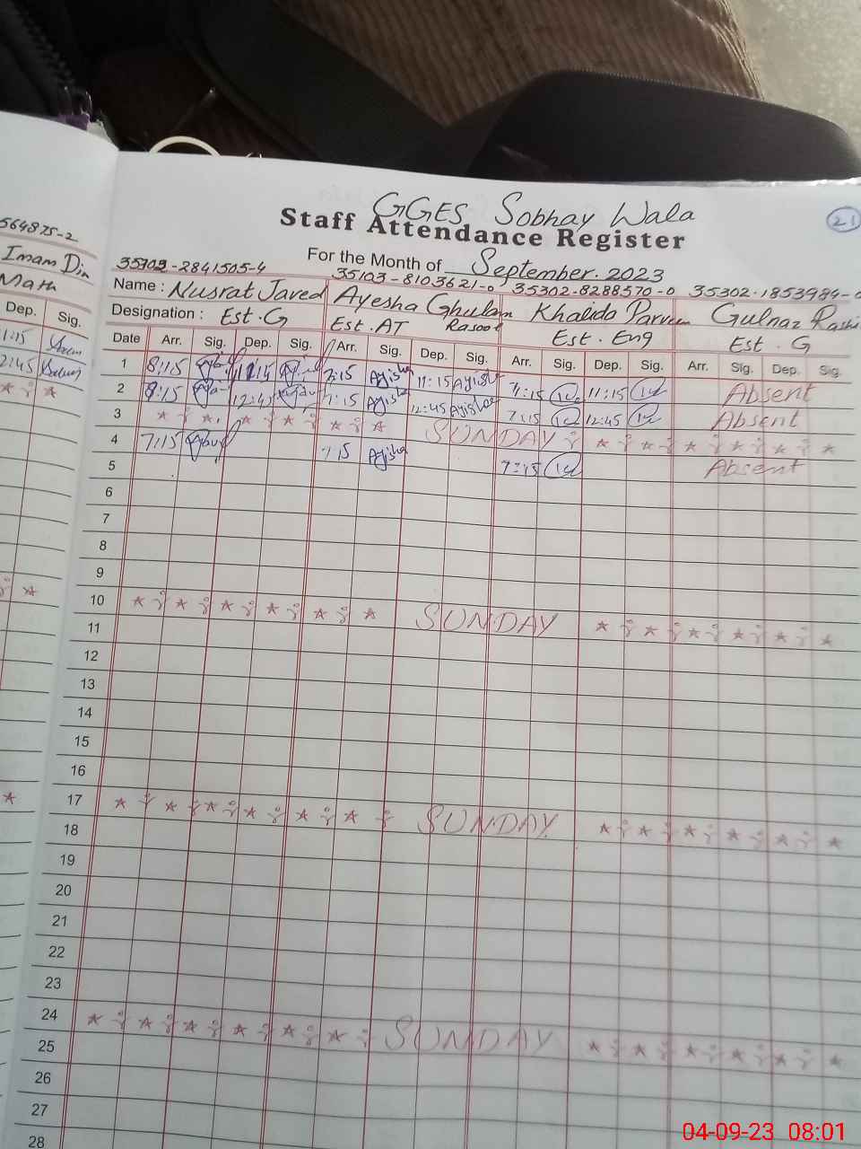| CNIC | Full Name | Designation | R/C | Absence During Last Calender Month |
