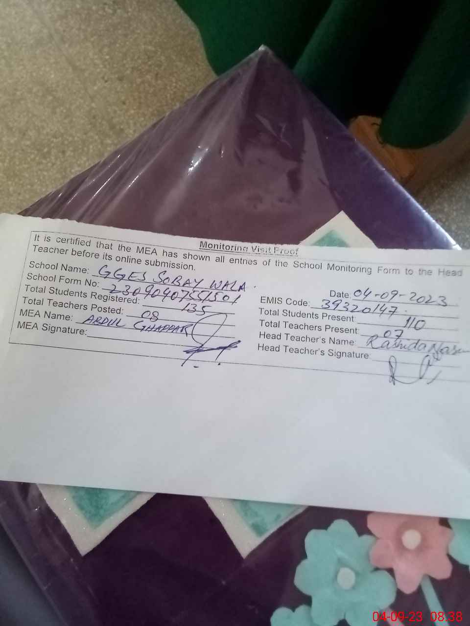 | Attendance Register | Head Teacher | MEA with School | Visit Proof |
