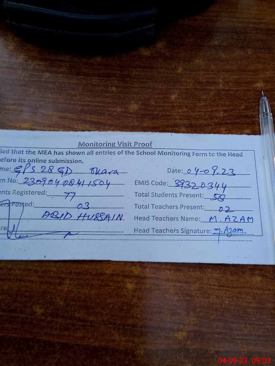 | Name: MU**** AZ**** Designation: (School Headmaster's/Headmistress's) PTC/JV Phone/Cell Number: 03**** |