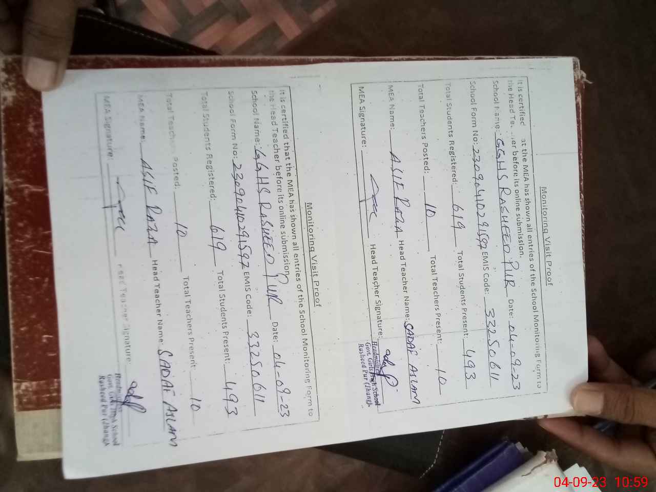 | Attendance Register | Head Teacher | MEA with School | Visit Proof |