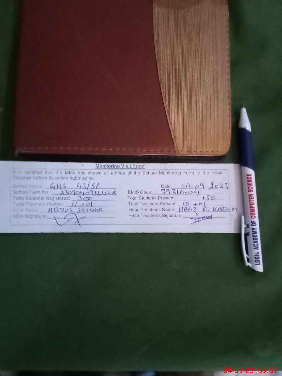 | Attendance Register | Head Teacher | MEA with School | Visit Proof |